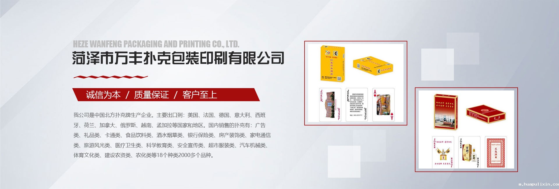 我公司是中国北方扑克牌生产企业。主要出口到:美国、法国、德国、意大利、西班牙、荷兰、加拿大、俄罗斯、越南、孟加拉等国家和地区。国内销售的扑克有:广告类、礼品类、卡通类、食品饮料类、酒水烟草类、银行保险类、房产装饰类、家电通信类、旅游风光类、医疗卫生类、科学教育类、安全宣传类、超市服装类、汽车机械类、体育文化类、建设农资类、农化类等18个种类2000多个品种。